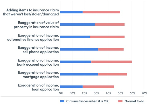 เมื่อถูกถามเกี่ยวกับทัศนคติของพวกเขาต่อการให้ข้อมูลเท็จเพื่อผลประโยชน์ทางการเงินหรือให้มูลค่าทรัพย์สินที่มากเกินความเป็นจริง ซึ่งเป็นที่รู้จักในวงการธนาคารว่าเป็นการฉ้อโกงโดยบุคคลที่หนึ่ง คนไทยครึ่งหนึ่งสนับสนุนพฤติกรรมเหล่านี้ มีประมาณ 25 เปอร์เซ็นต์ของผู้ตอบแบบสอบถามกล่าวว่ามีบางสถานการณ์ที่เป็นเรื่องปกติที่จะแสดงรายได้เกินจริงในการขอสินเชื่อทั่วไปหรือสินเชื่อบ้าน ในขณะที่อีก 25 เปอร์เซ็นต์คิดว่าเป็นเรื่องปกติที่จะทำเช่นนั้น การสำรวจพบว่าผู้บริโภคในสัดส่วนที่ใกล้เคียงกันจะเรียกร้องค่าสินไหมทดแทนเกินจริงหรือมีเพิ่มรายการในการเรียกร้องด้วย