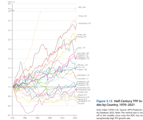 ตัวอย่างข้อมูลจาก APO Productivity Databook 2023: ภาพ 5.13 ดัชนีความสามารถในการผลิตปัจจัยรวมครึ่งศตวรรษตาประเทศ ปี 1970-2021 (กราฟิก: Business Wire)