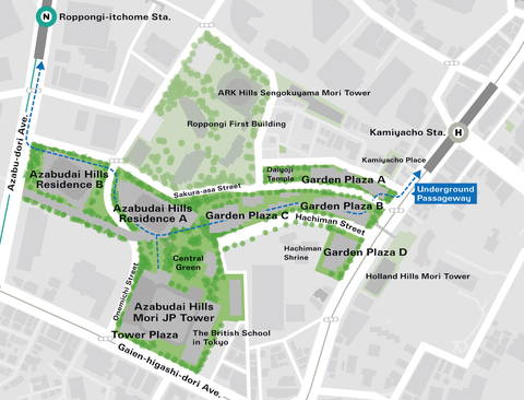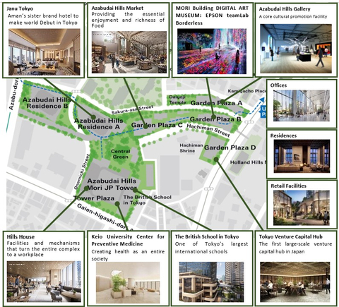 Azabudai Hills โอบรับแนวคิดของ “Modern Urban Village” เป็นสถานที่สำคัญที่อุดมไปด้วยธรรมชาติ พร้อมด้วยศูนย์ธุรกิจระดับโลก สิ่งอำนวยความสะดวกสำหรับการค้าปลีกและที่พักอาศัยที่น่าสนใจ และพื้นที่เปิดโล่งขนาดใหญ่ที่เต็มไปด้วยต้นไม้เขียวขจีที่ดึงดูดผู้คนให้มารวมกัน วิสัยทัศน์ของ Mori Building คือต้องการให้ Azabudai Hills กลายเป็นชุมชน “สีเขียวและสุขภาพที่ดี (Green & Wellness)” ซึ่งผู้คนใช้ชีวิตอย่างกลมกลืนกับธรรมชาติและมีชีวิตที่มีสุขภาพดีและเติมเต็ม Azabudai Hills มีอาณาบริเวณกว้างประมาณ 8.1 เฮกตาร์มีพื้นที่สีเขียวขจีที่น่าประทับใจถึง 24,000 ตร.ม. โดยมีพื้นที่ทั้งหมดประมาณ 861,700 ตร.ม. รองรับการใช้งานในเมืองที่หลากหลาย รวมถึงสำนักงาน ที่พักอาศัย สถานที่ค้าปลีก สิ่งอำนวยความสะดวกทางวัฒนธรรม สถาบันการศึกษา และสถานพยาบาล